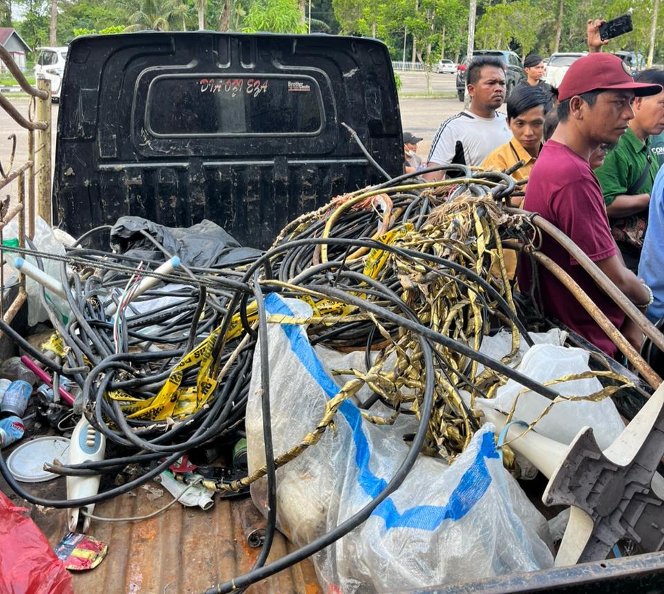 Selain kesepuluh pelaku, Polisi juga mengamankan sejumlah barang bukti (BB) diantaranya 4 Unit Mesin Reading Injector, 1 Unit Mobil Daihatsu Grand Max warna Hitam, 1 Unit gergaji Besi, 1 set alat pemotong besi, 1 besi tiang listrik, 2 Gulung kabel sepanjang Panjang 20 meter utuh, 57 gulung kabel sudah terkelupas, 15 Gulung kulit kabel, 1 Unit Sepeda motor merk Yamaha, 4 pisau cutter, 1 gunting Besi, sebilah parang dan 2 Gergaji besi.