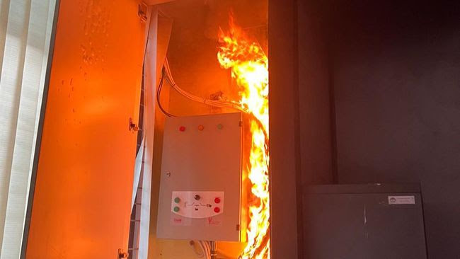 Hanya beberapa menit saja api langsung keluar dan membakar kabel di bagian luar dinding. Pegawai yang sigap pun berlarian mencari racun api untuk pemadaman.