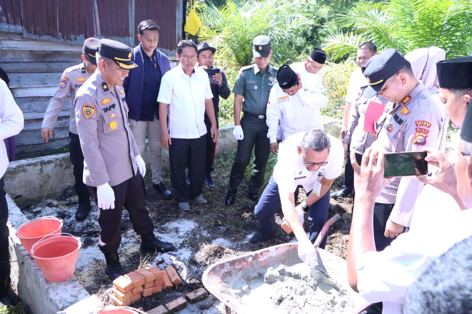 Kegitan Bedah rumah presisi diawali dengan peletakan batu pertama yang di lakukan oleh perwakilan dari Polres Siak yang diwakili Kabag SDM, Ketua Baznas Kabupaten Siak dan dan Pemkab Siak yang diwakili Ast.2 Kabupaten Siak disaksikan oleh Unsur pemerintah Kecamatan Mempura dan Kelurahan, serta tokoh dan masyarakat yang hadir. (Manik/MR)