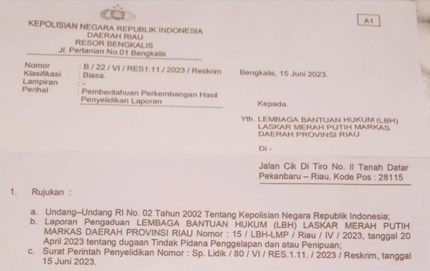 Surat bernomor B/22/VI/RES1.11/Reskrim tertanggal 15 Juni 2023 yang ditandatangani Kasat reskrim Polres Bengkalis AKP Muhammad Reza SIK MH, dituliskan telah dikeluarkan Surat Perintah Penyelidikan Nomor : Sp. Lidik/80/VI/RES1.11/2023 Reskrim tanggal 15 Juni 2023.