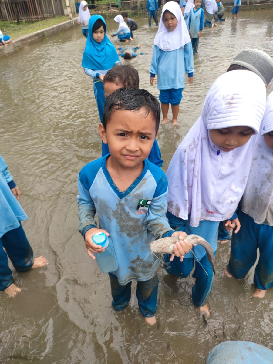 Kegiatan itu terlihat semakin seru saat para murid menangkap ikan lele di kolam lumpur usai menanam padi.