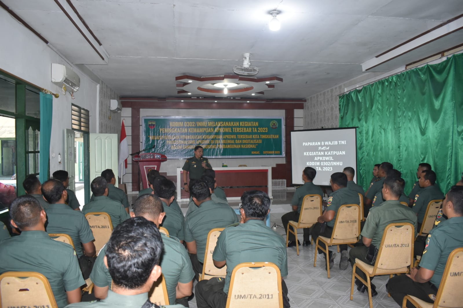 Rengat, MimbarRiau.com -- Untuk membekali serta meningkatkan pengetahuan dan kemampuan personel aparat Komando Kewilayahan dalam pelaksanaan pembinaan teritorial, Kodim 0302 /Inhu menggelar kegiatan peningkatan Kemampuan Apkowil Tersebar Tahun Anggaran 2023.