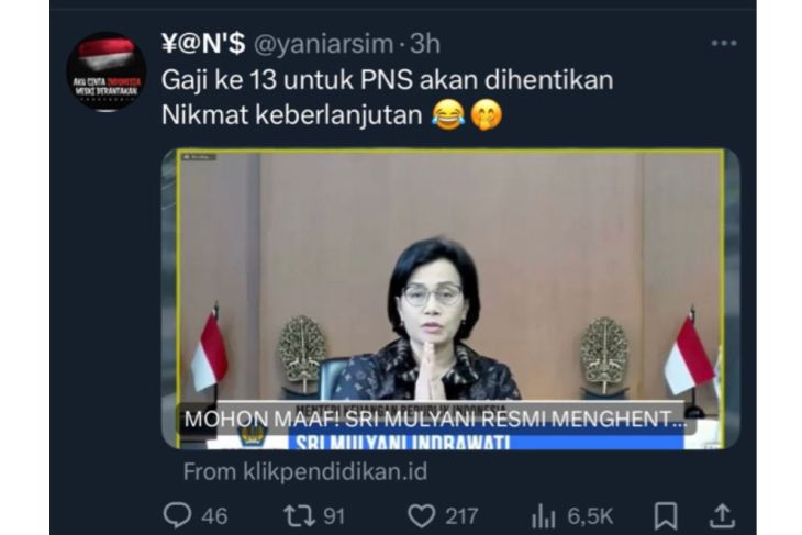 MIMBARRIAU.com - Sebuah unggahan di X menarasikan Menteri Keuangan Sri Mulyani resmi menghentikan gaji ke-13 bagi Pegawai Negeri Sipil (PNS).