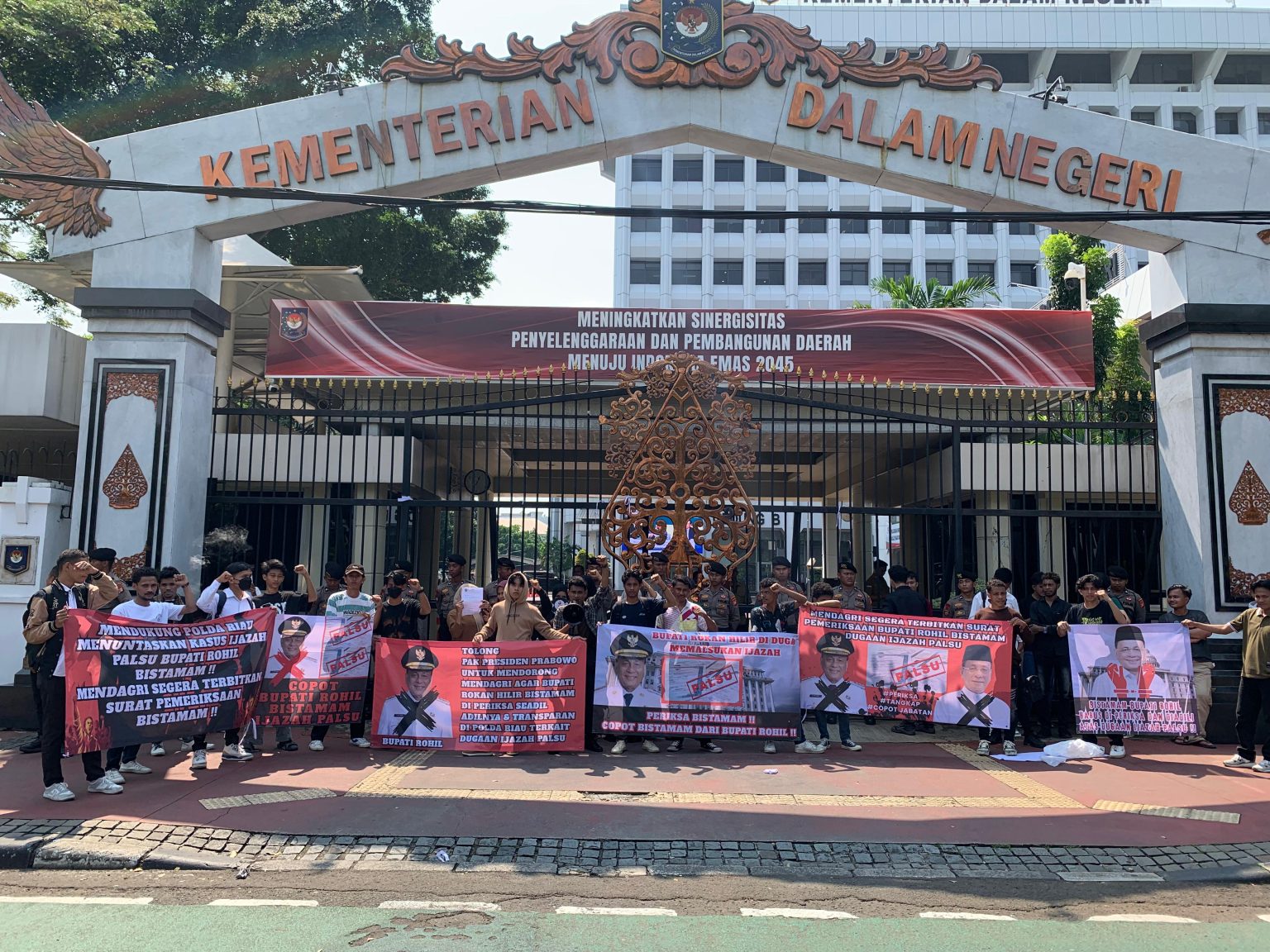 Perwakilan Menteri Dalam Negeri menerima pernyataan sikap dan tuntutan AMRB terkait kasus dugaan ijazah palsu Bupati Rokan Hilir Bistamam, Kamis (10/7/2025) siang di depan kantor Kemendagri di Jakarta. foto/ist