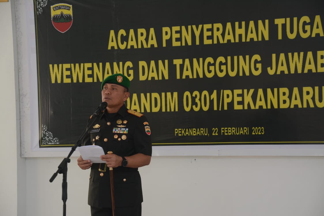 MimbarRiau.com, Pekanbaru, Komandan Kodim 0301/Pbr Kolonel Inf Nur Rohman Zein, S.E., M.M., menyerahkan Tugas, Wewenang dan Tanggung Jawab Jabatan Dandim 0301/Pekanbaru kepada Danrem 031/Wira Bima Brigjen TNI Parlindungan Hutagalung, S.A.P.